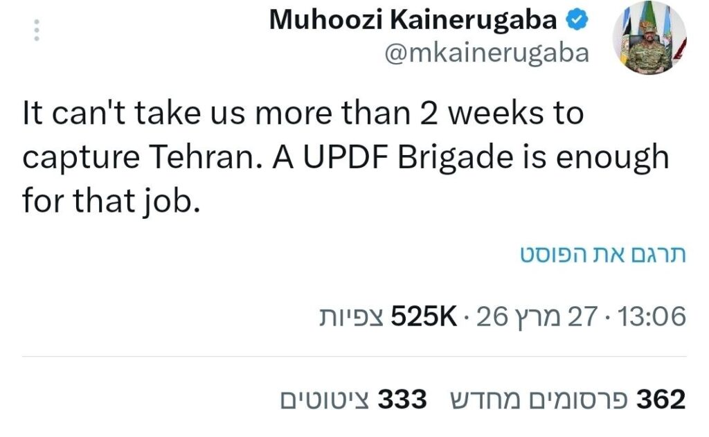 Muhoozi Kainerugaba, Chef der ugandischen Volksverteidigungskräfte, überschwemmt Twitter weiterhin mit pro-israelischen Tweets: