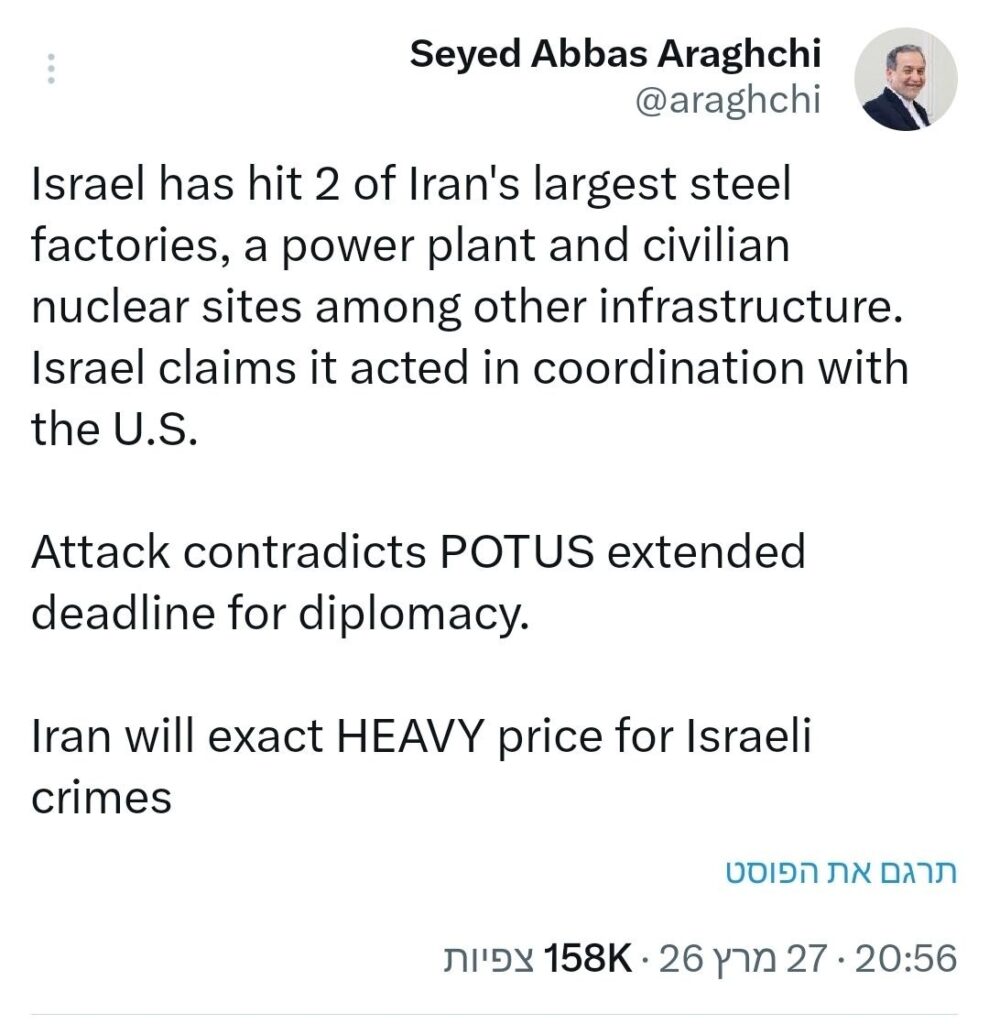 Der iranische Außenminister Abbas Araghchi reagiert auf die heutigen israelischen strategischen Angriffe: