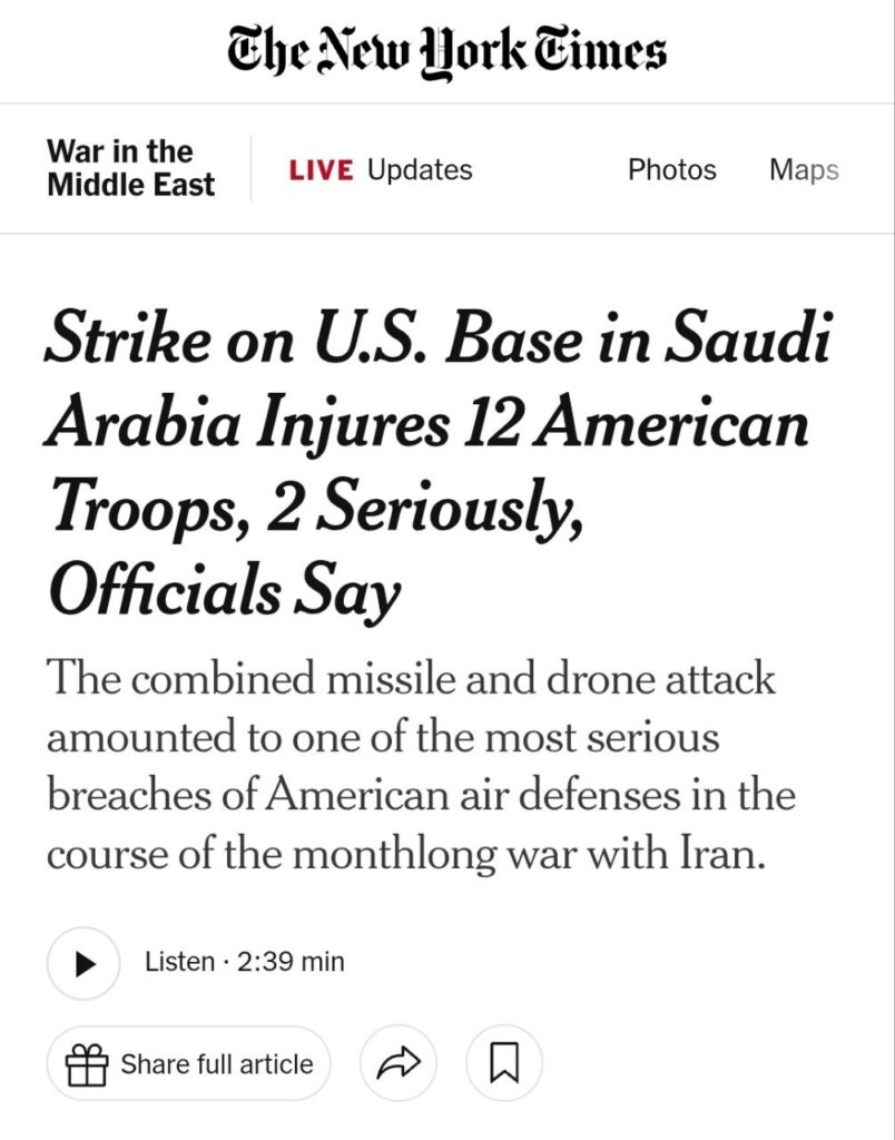 Bei einem kombinierten iranischen Angriff mit Raketen und Drohnen auf einen amerikanischen Stützpunkt in Saudi-Arabien wurden gestern Abend 12 amerikanische Soldaten verletzt, zwei von ihnen schwer.