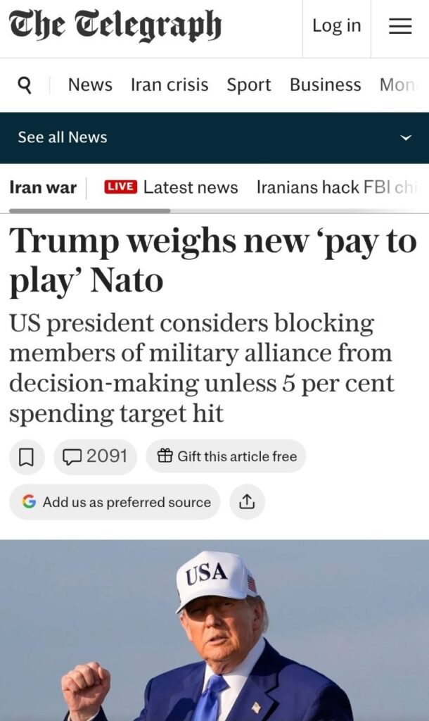 Er schlägt ein System vor, in dem Länder, die nicht 5% ihres BIP für Verteidigung ausgeben, ihr Mitspracherecht bei wichtigen Entscheidungen, einschließlich Militäreinsätzen, verlieren könnten [damit zielt er vor allem auf Spanien ab].