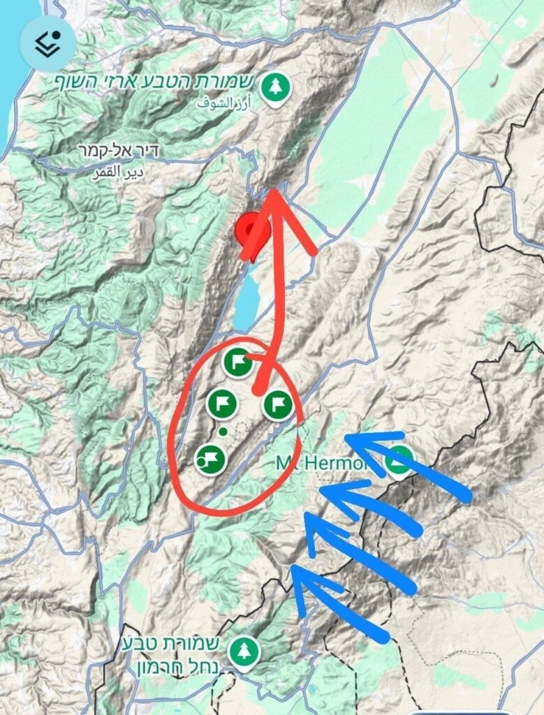Libanesische Kanäle, die mit der Hisbollah verbunden sind, schätzen, dass die IDF beabsichtigt, diese Dörfer auf dem Landweg aus dem syrischen Hermon-Gebiet zu erreichen – ich habe die vorgeschlagene Richtung gemäß diesen Kanälen mit Pfeilen markiert.