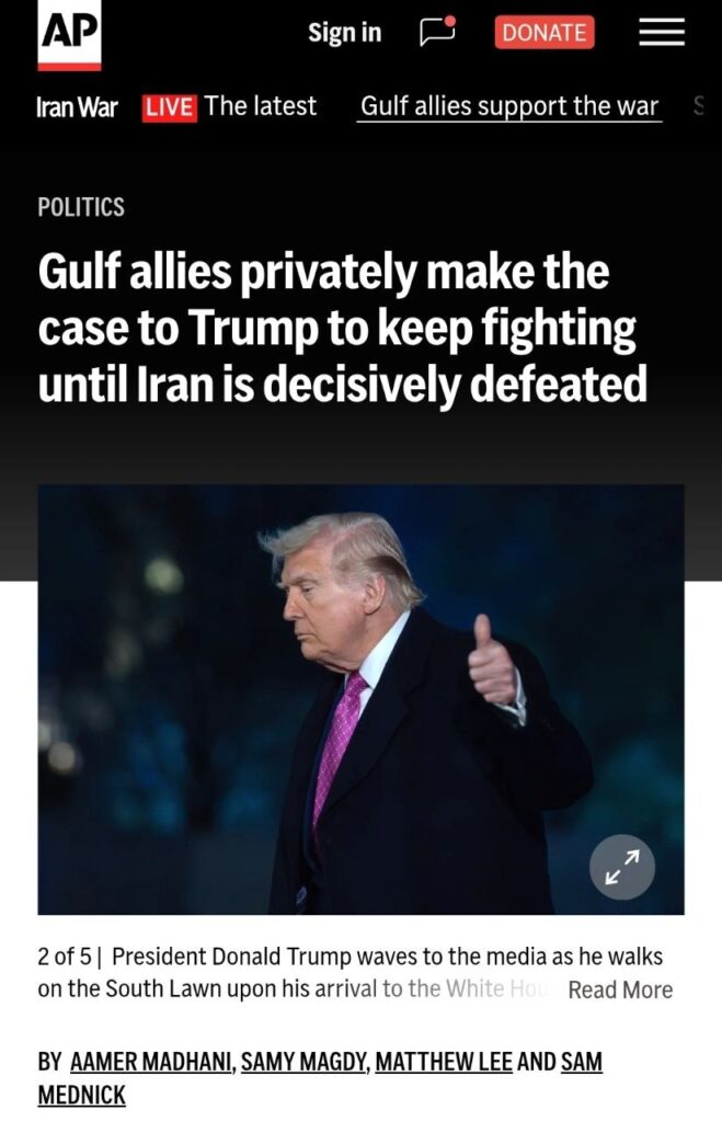 Die Nachrichtenagentur AP berichtet, dass die Golfstaaten die USA insgeheim drängen, die Angriffe im Iran fortzusetzen, da das iranische Regime noch nicht ausreichend geschwächt sei.