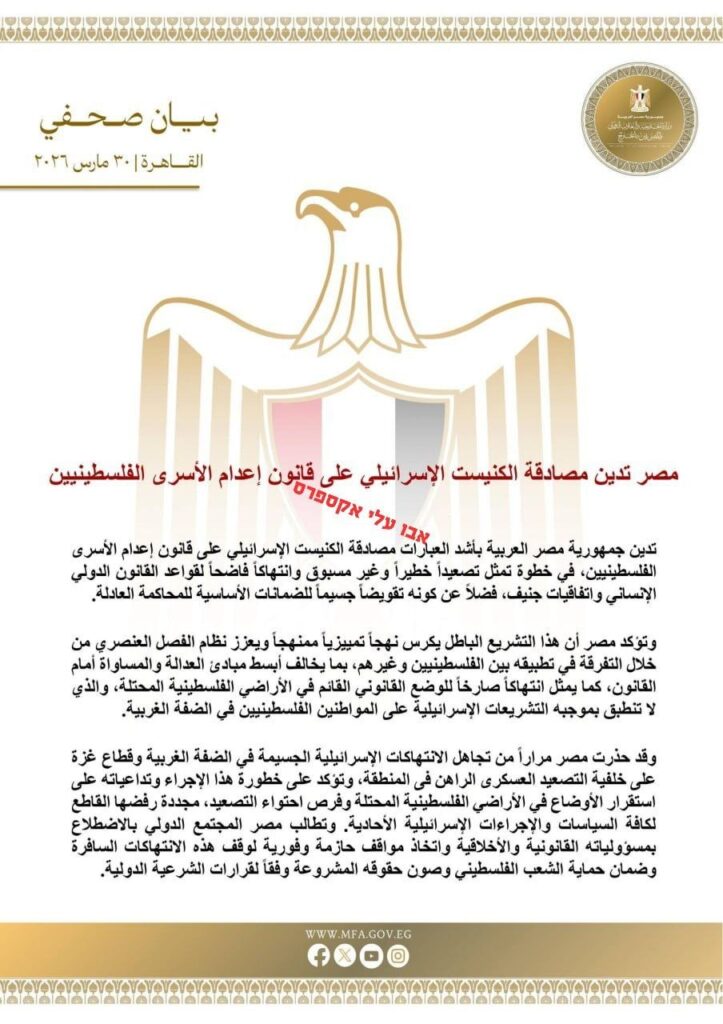 Ägypten verurteilt die Verabschiedung des Gesetzes zur Todesstrafe für Terroristen in der Knesset aufs Schärfste.