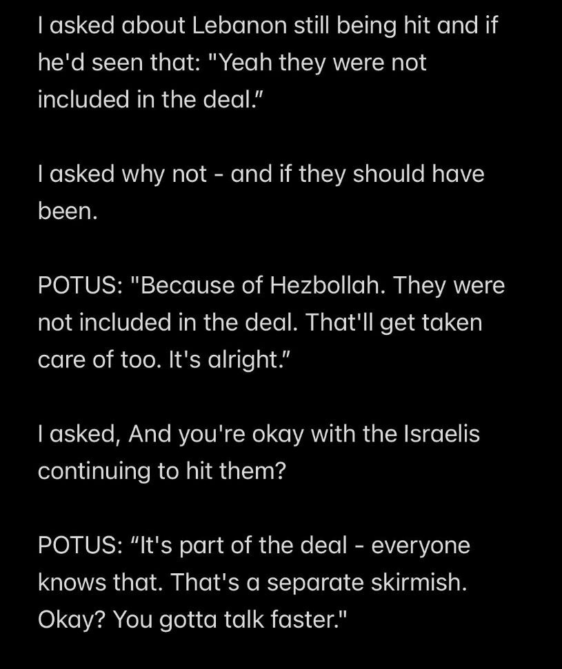 • Der Waffenstillstand wurde in voller Abstimmung zwischen den USA und Israel erreicht. Das hat uns nicht überrascht.