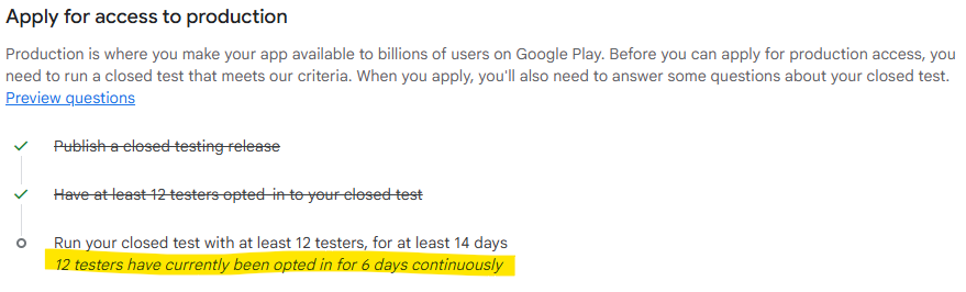 Anmerkung: Google zeigt nicht, wie viele Tester effektiv aktiv sind, also die App auch wirklich hie und da aufstarten. Angezeigt wird nur, wie viele noch bis 12 fehlen, danach wird stets „12“ (also: genug) angezeigt.