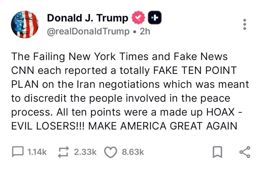 „Medien wie die New York Times und CNN verbreiteten Lügen zu diesem Thema und propagierten einen 10-Punkte-Plan. Es handelt sich um einen Betrug, der darauf abzielt, diejenigen zu diskreditieren, die an der Erreichung des Abkommens gearbeitet hatten„