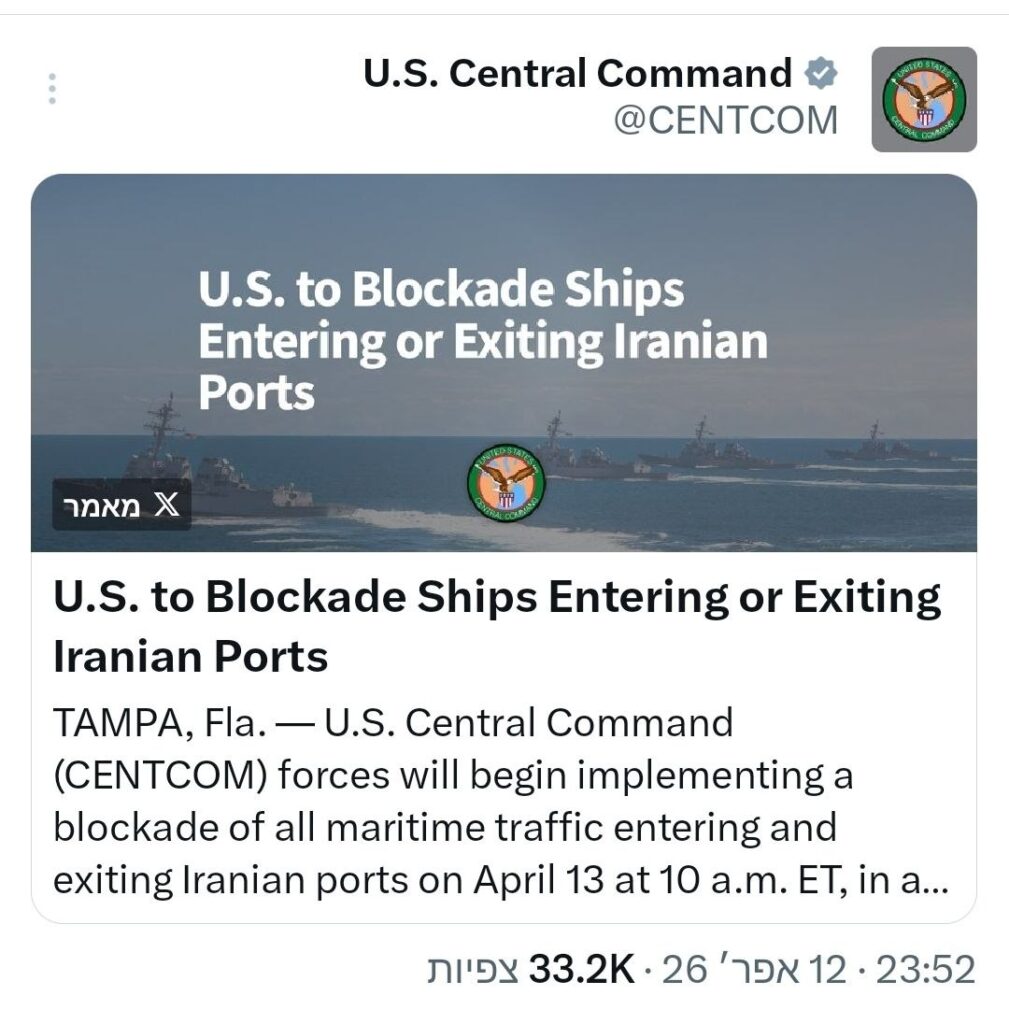 Das US-Zentralkommando gibt bekannt, dass gemäß der Anweisung von Präsident Trump ab dem 13. April um 10:00 Uhr Ostküstenzeit (17:00 Uhr israelischer Zeit) eine Blockade aller Schiffe verhängt wird, die iranische Häfen im Golf von Oman und im Arabischen Golf [eine Bezeichnung, die die Iraner verärgert] verlassen oder sich auf dem Weg dorthin befinden.