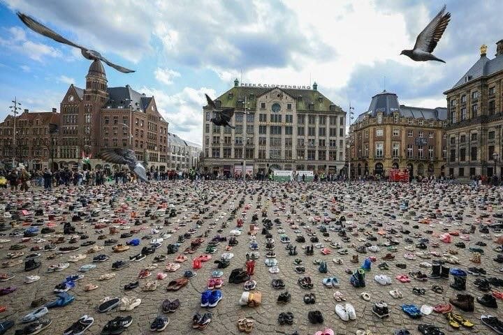 Eine Schuhinstallation zum Gedenken an die (angeblich) im Krieg getöteten Kinder von Gaza wurde auf dem Dam-Platz in Amsterdam aufgestellt.
